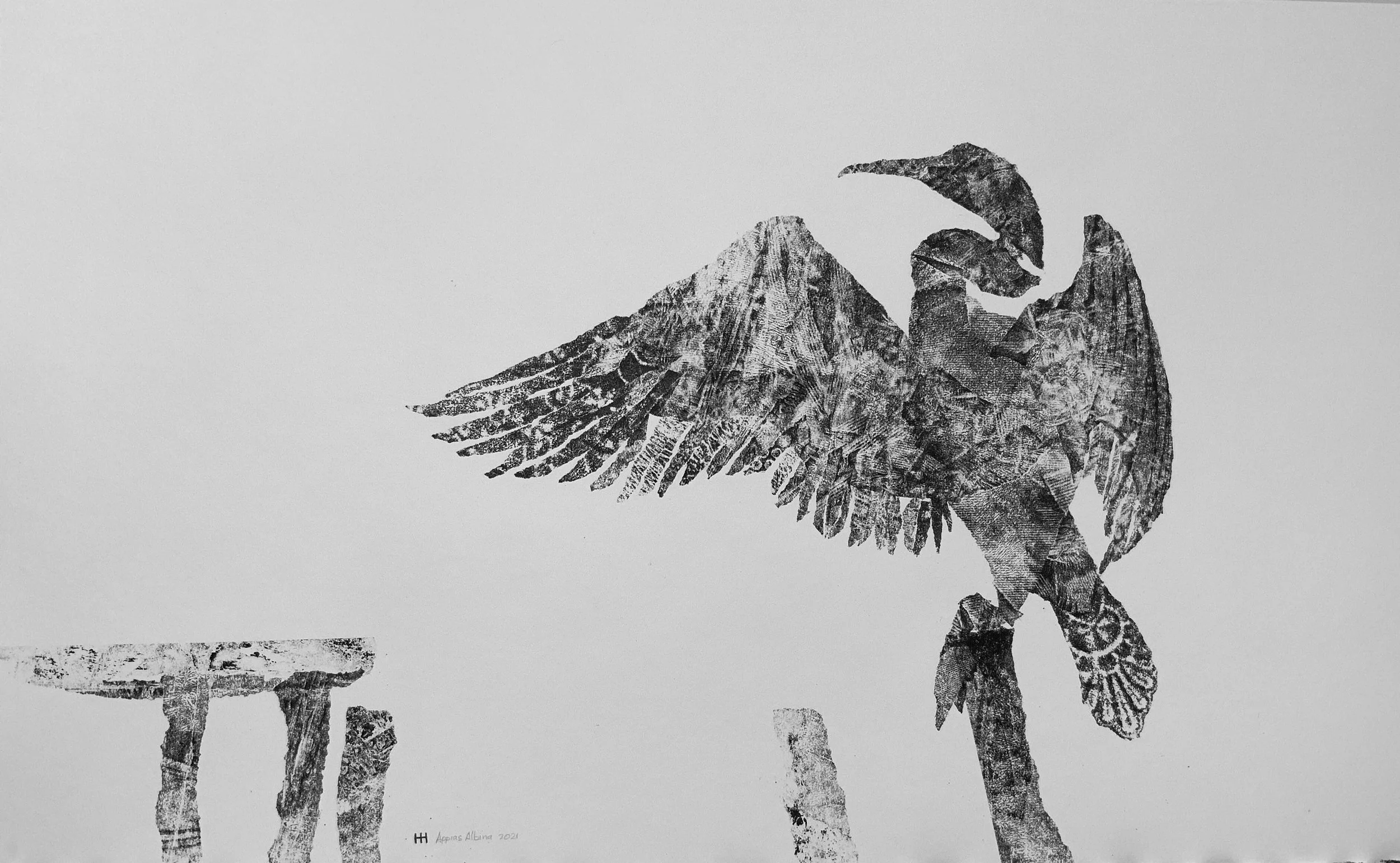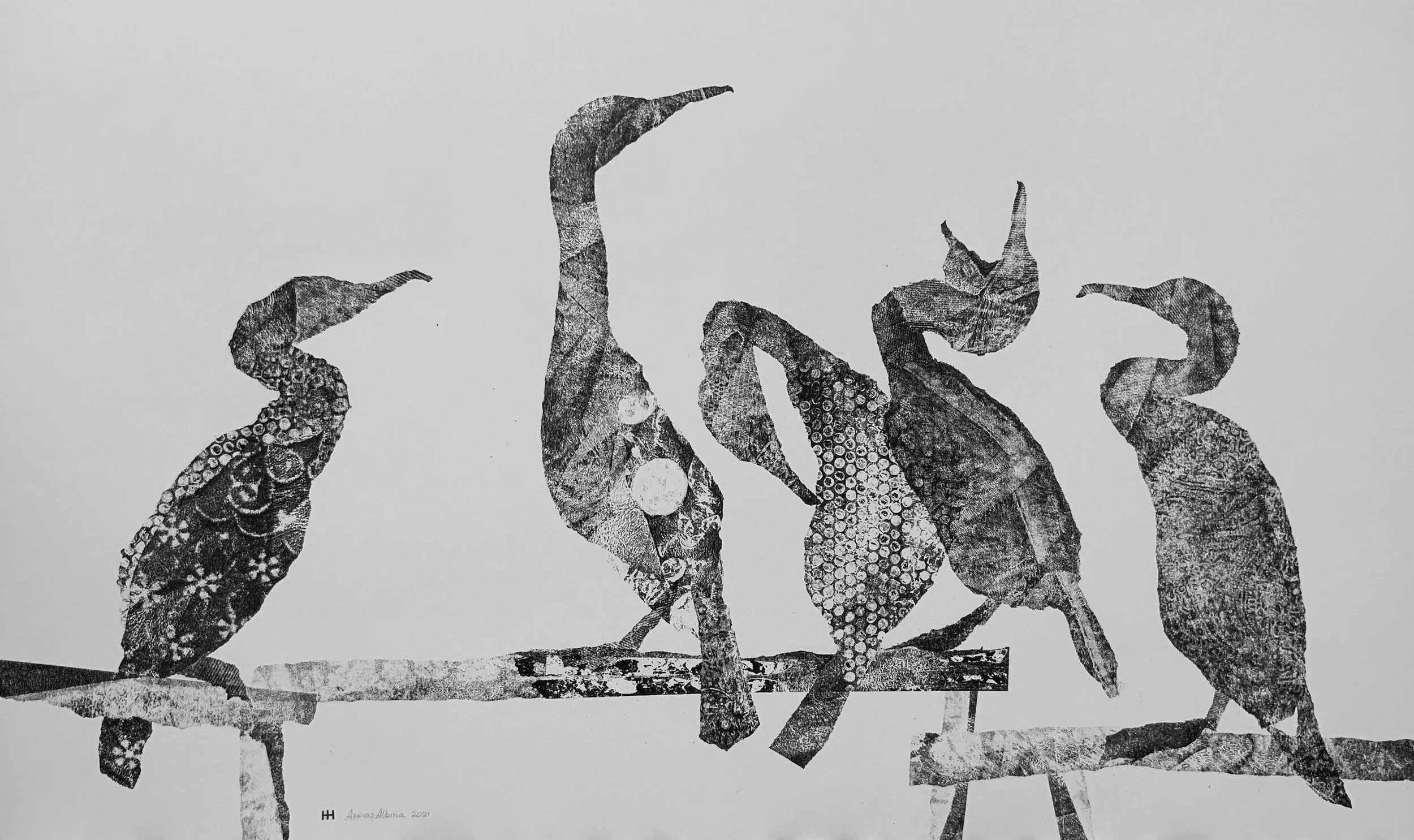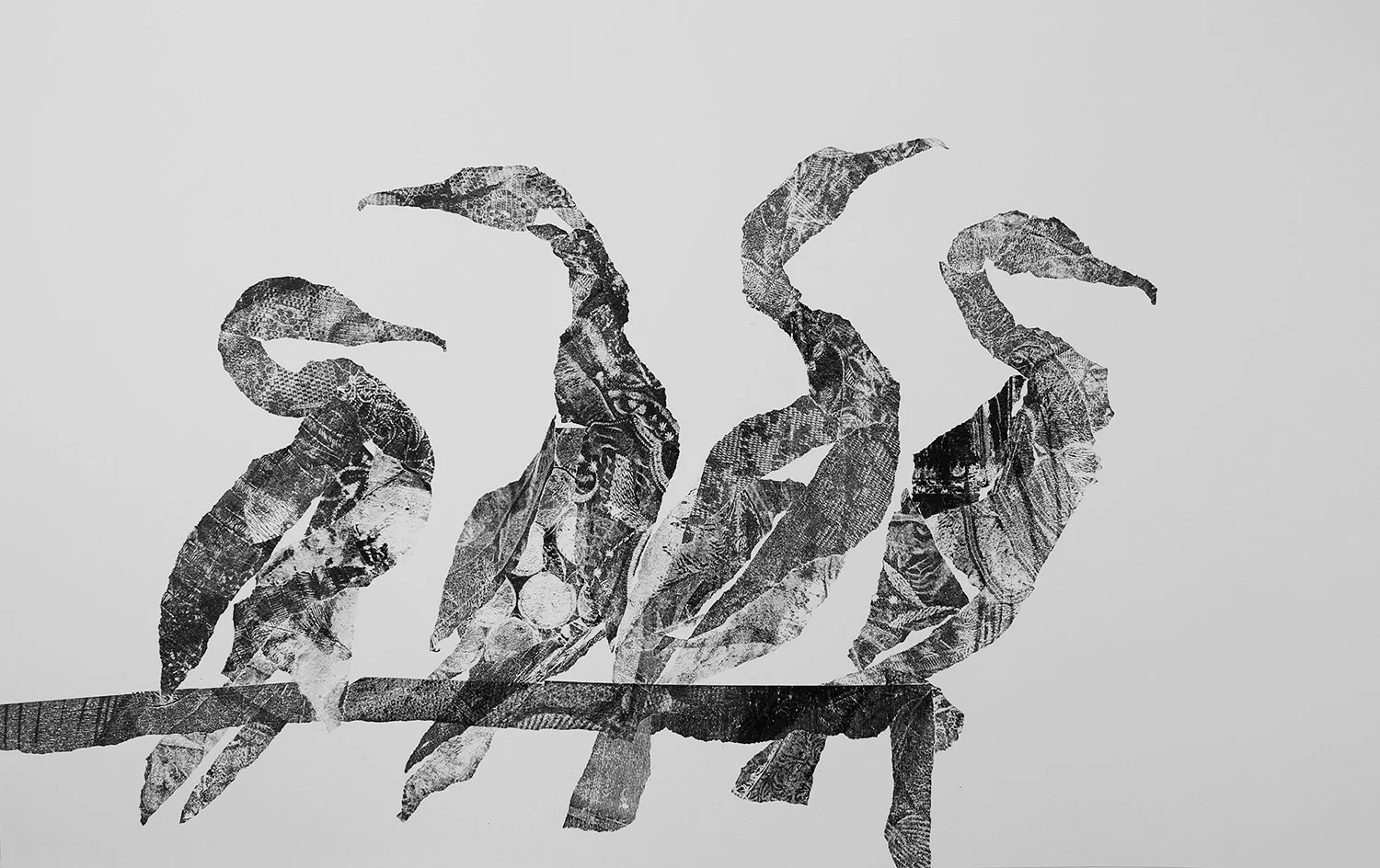 Lace Cormorants, 2021. Carbon monotype on paper.