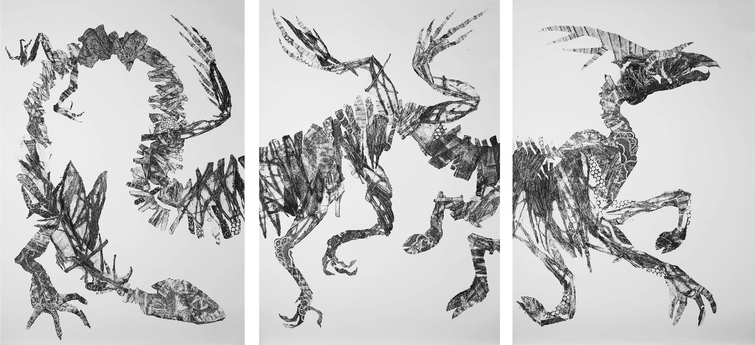 Thirteenth / Jersey Devil, 2021. Carbon monotype on paper. Triptych total 210x100 cm